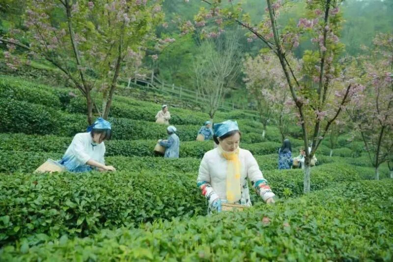 他们依着山势顺着水流的情况,种植茶叶并且培育菌类,把党建和农旅发展紧密结合起来,村支部发挥带头作用,企业负责搭建平台,合作社积极牵线搭桥,农户踊跃参与、出力干活,顺着山的形态,四百亩的茶园伸展开来,在茶垄中间修建了步道,步道旁边密密麻麻地栽种着樱花、桃花,就是为了让人走入其中,沉醉在这美景之中。
